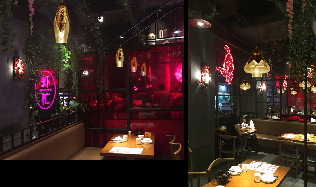 蝦忙餐廳第一感覺紅,入目皆是紅。紅色花鳥背景、鐵架隔斷、綠植纏繞,形成錯亂的空間,再配以歐式燈飾,明黃色燈罩,昏暗的環(huán)境一抹黃光照出,使整個環(huán)境充滿暖意,既不喧賓奪主,卻又是餐廳的點睛之筆,使原本冷硬的環(huán)境變得柔軟。