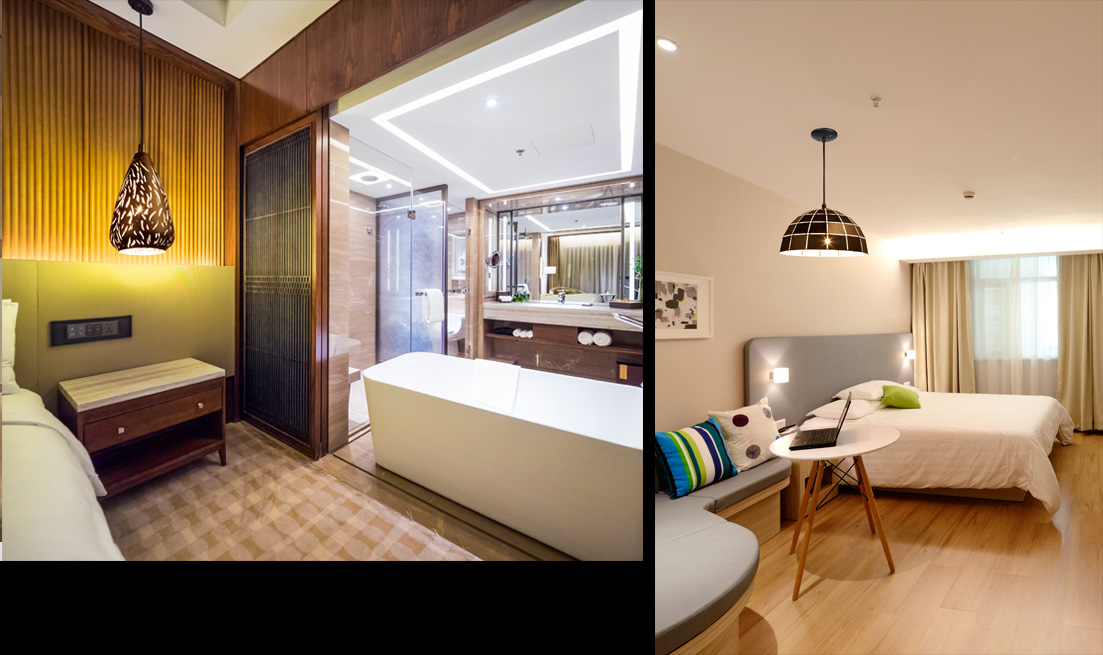 走進(jìn)酒店,大堂富麗堂皇,餐廳古色古香,實(shí)木桌椅錯落有致的擺放。目光所及之處無一不透露著精致。每張餐桌上方都懸掛著一盞球型鐵藝燈,照耀出明黃色燈光。再走進(jìn)住房部,簡易單雙間、豪華單雙間、總統(tǒng)套房等皆因設(shè)計(jì)風(fēng)格的不同配以不同的燈藝裝飾,處處洋溢的美式風(fēng)情。